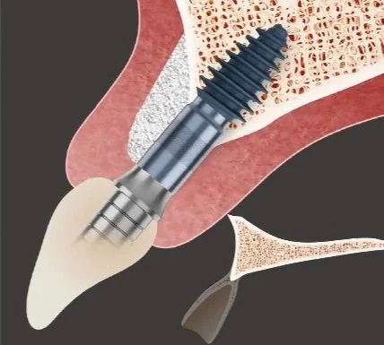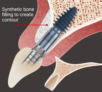 The thread section with XPEED® surface treatment, which is implanted in the non-degenerated basal bone, maintains stable strong osseointegration, ensuring long-term implant stability even if the alveolar bone is lost.