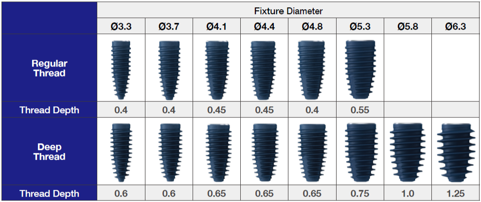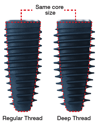 Dziļās vītnes mala ir par 0,2 mm garāka, saglabājot to pašu kodolu. Tas nodrošina par 0,4 mm lielāku kopējo diametru, tādējādi uzlabojot primāro stabilitāti.