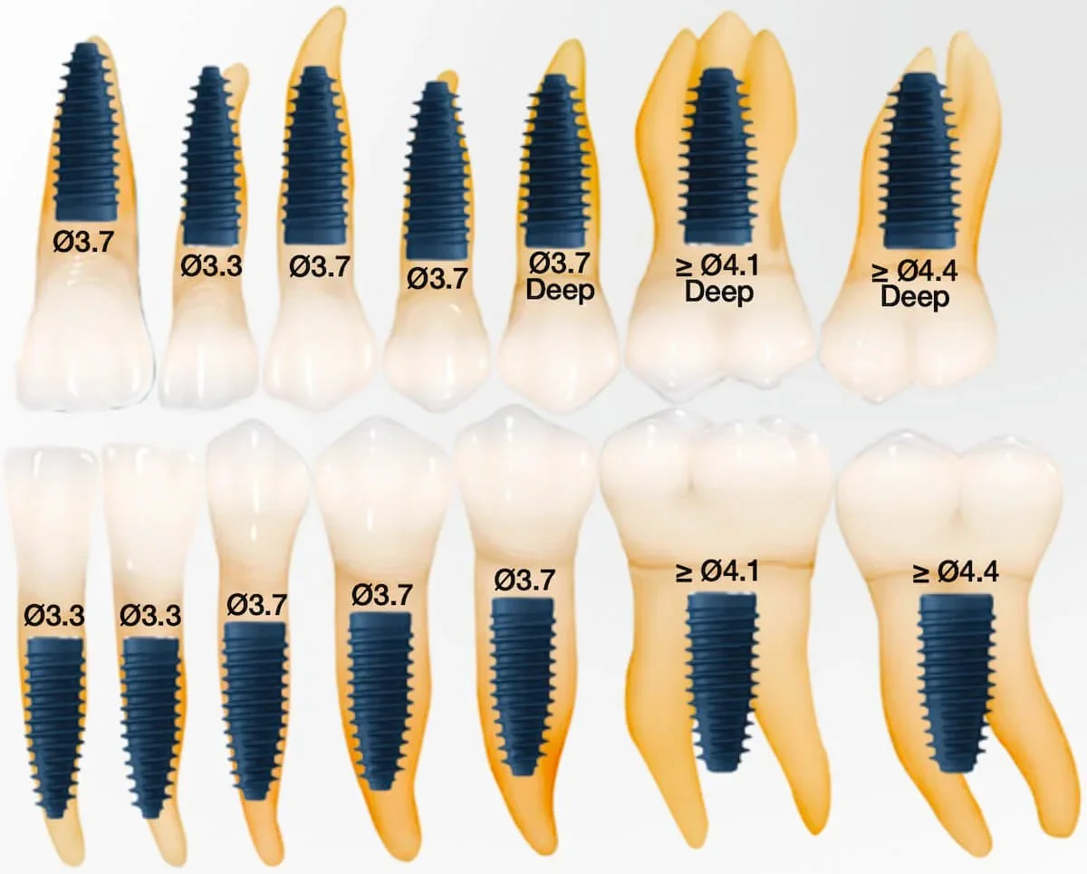 Izmantojiet ø3,3 mm implantu apakšžokļa priekšzobiem un sānu incisīviem.