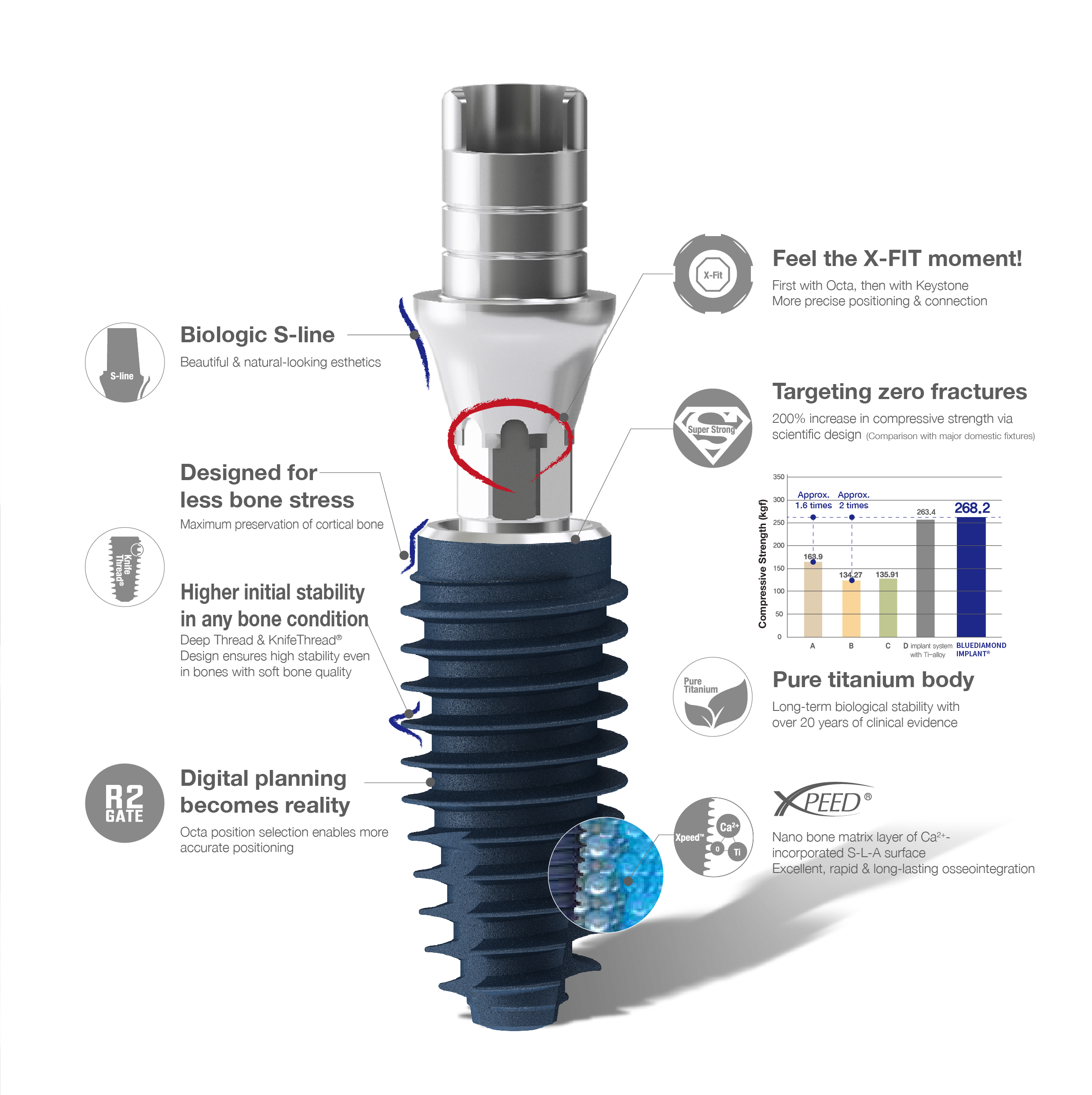 BLUEDIAMOND IMPLANT® implants are designed for durability and long-term stability, being 200% stronger than any other implant.